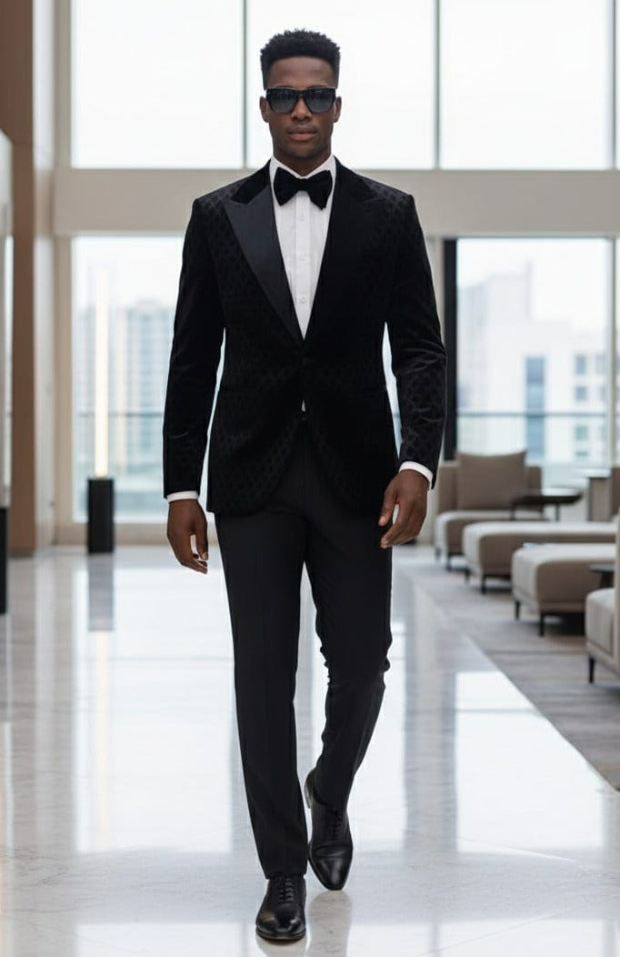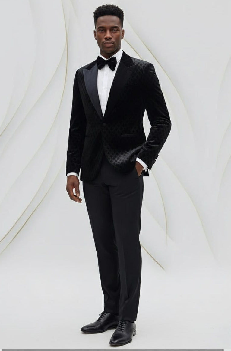 EFFETTI BY Giovanni Testi 2 Piece Slim Fit Velvet Suit, Diamond pattern, Black Satin Peak Lapel, 1 Button, Center Vent, Black Satin Pants.