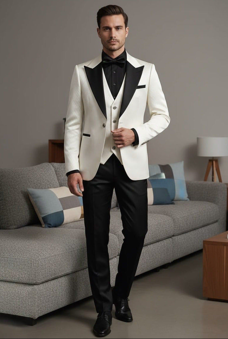 EFFETTI BY Giovanni Testi 3 Piece Slim Fit Suit, Ivory-Diamond Design, Black Satin Peak Lapel with 1 Button, Center Vent.