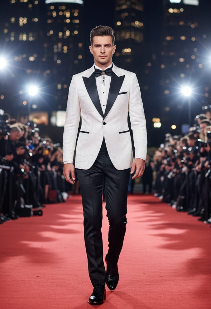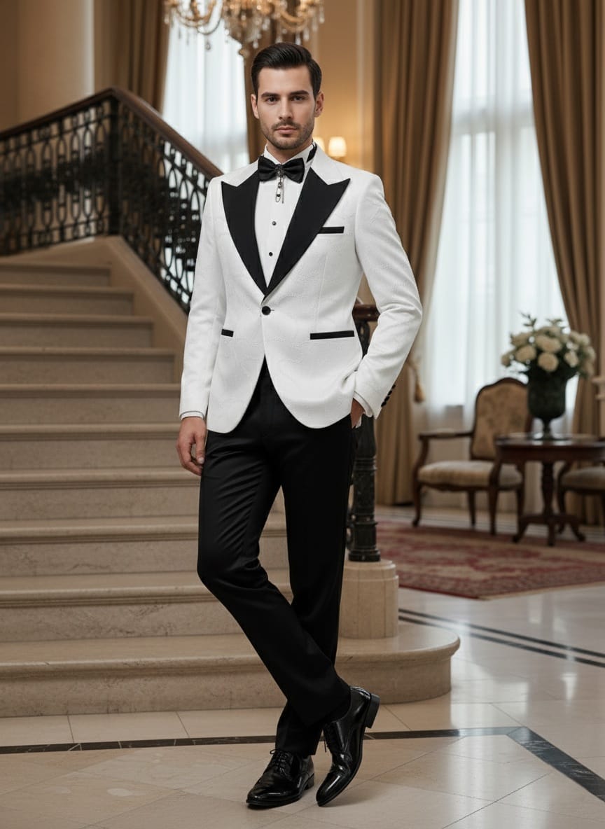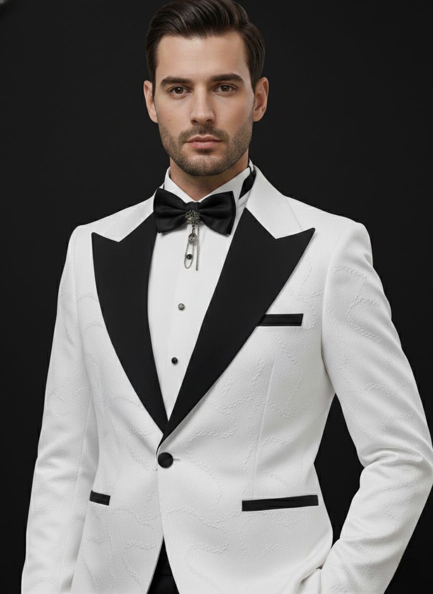 EFFETTI BY Giovanni Testi 2 Piece Slim Fit Suit, White Chain Design, Black Satin Peak Lapel, 1 Button, Center Vent.
