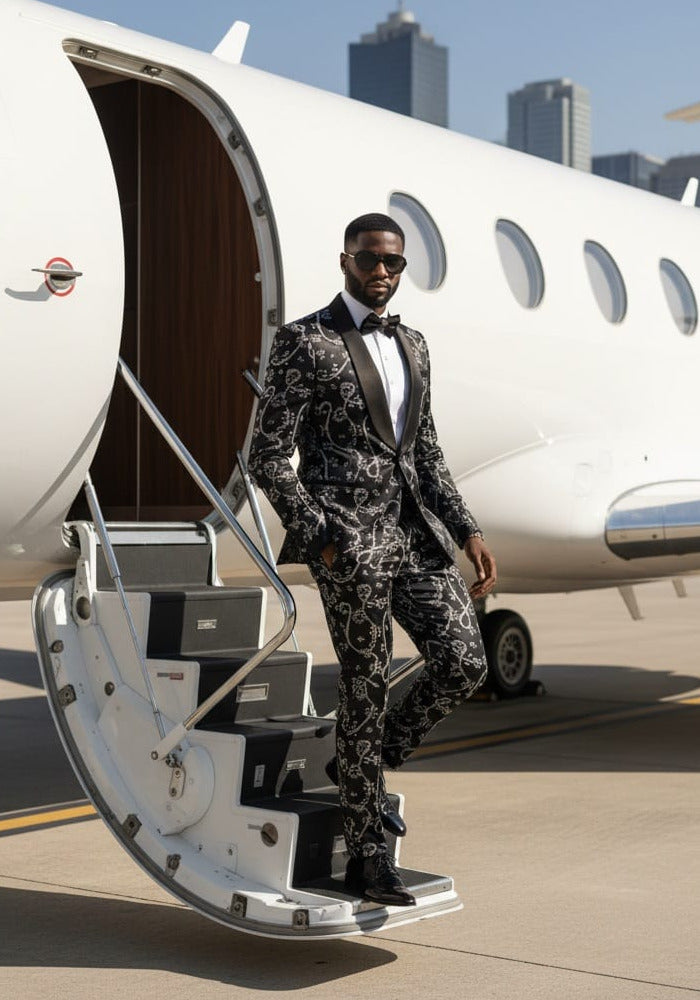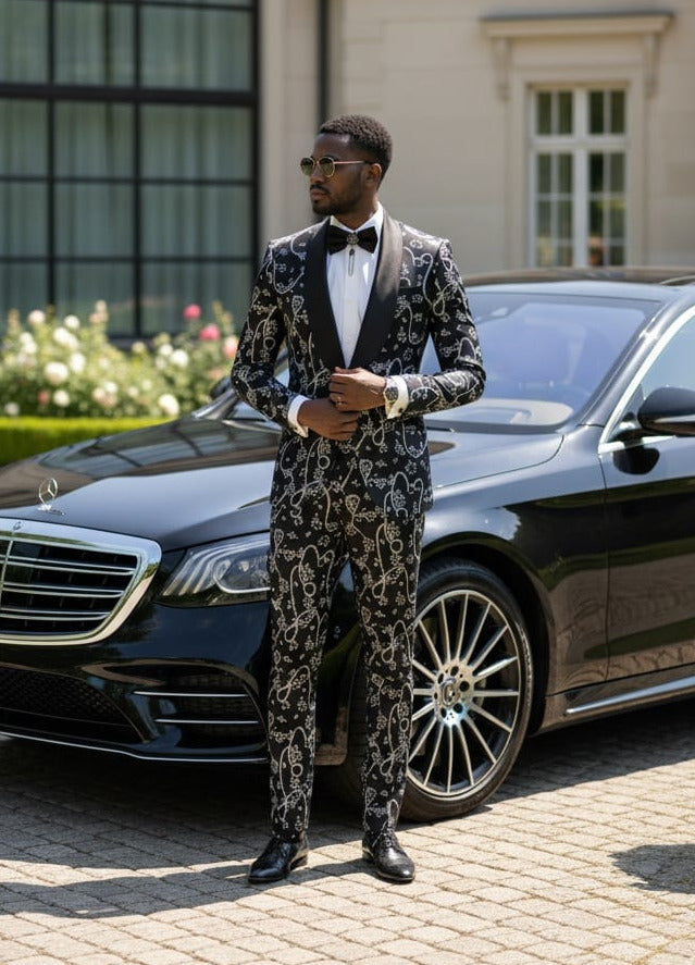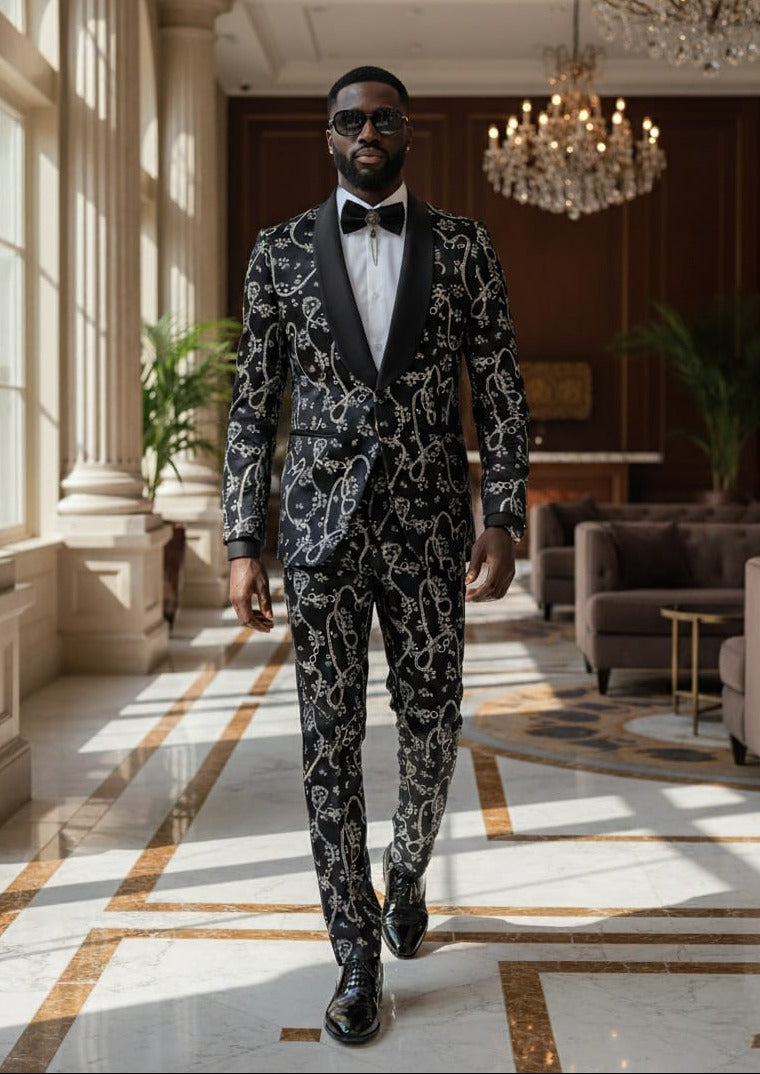 EFFETTI BY Giovanni Testi 2 Piece Slim Fit Suit, Floral - Chain Design, Black Satin Shawl Lapel, 1 Button, Center Vent.