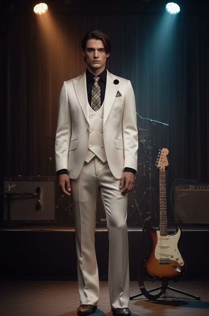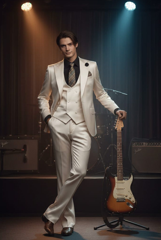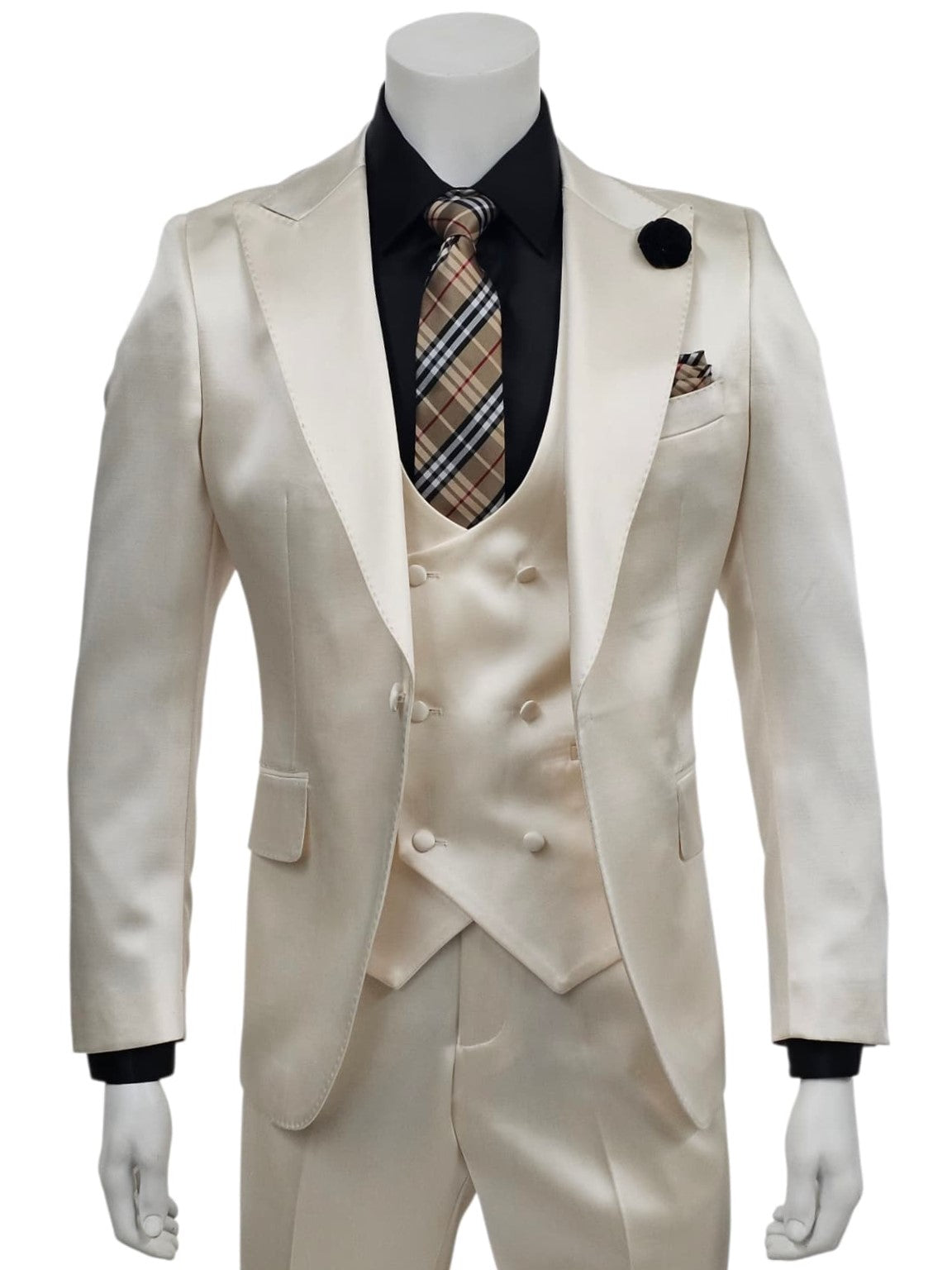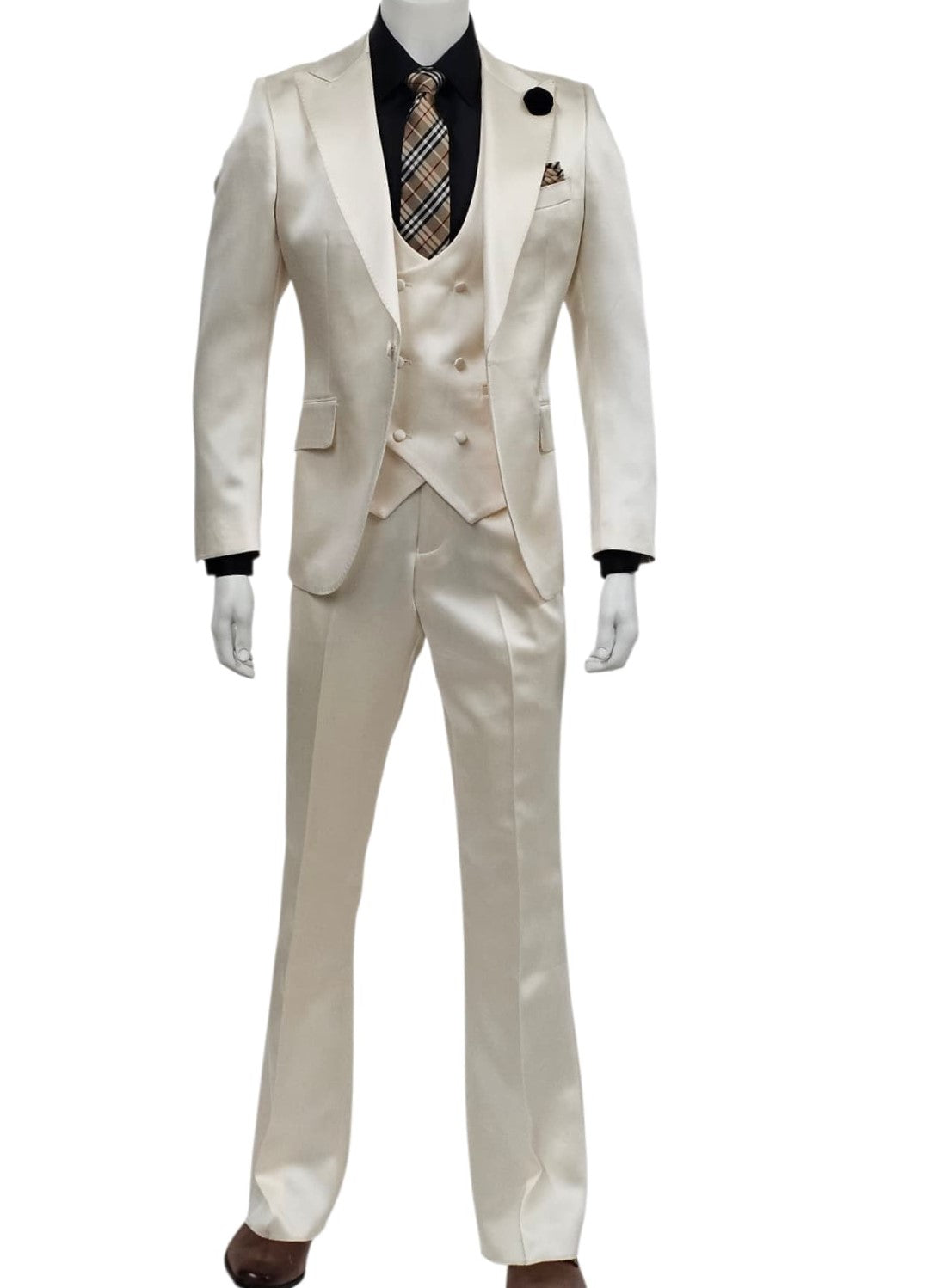 GIOVANNI TESTI SLIM FIT Satin 3 Piece Suit, 1 Button, Peak Lapel, Double Breasted Vest, Center Vent, Shiny Fabric, Matching pants with flair hem.