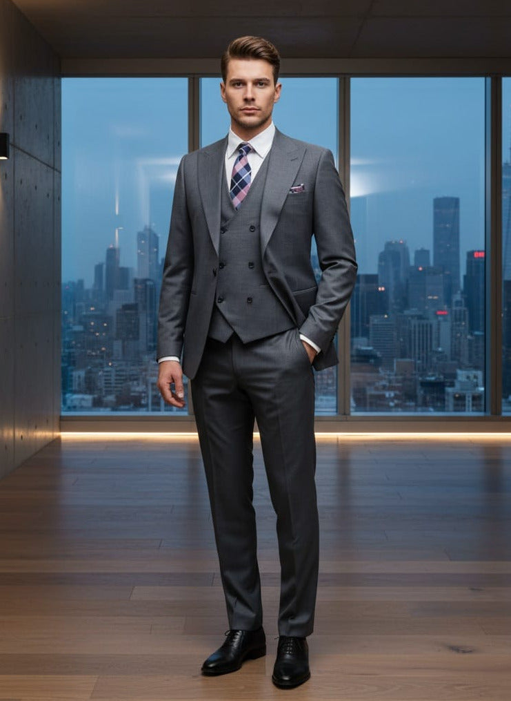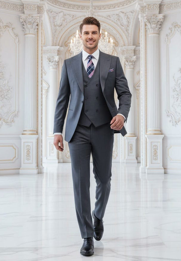 GIOVANNI TESTI SLIM FIT Suit with Stretch Fabric, Peak Lapel, 1 Button, Double Breast Vest, Center Vent.