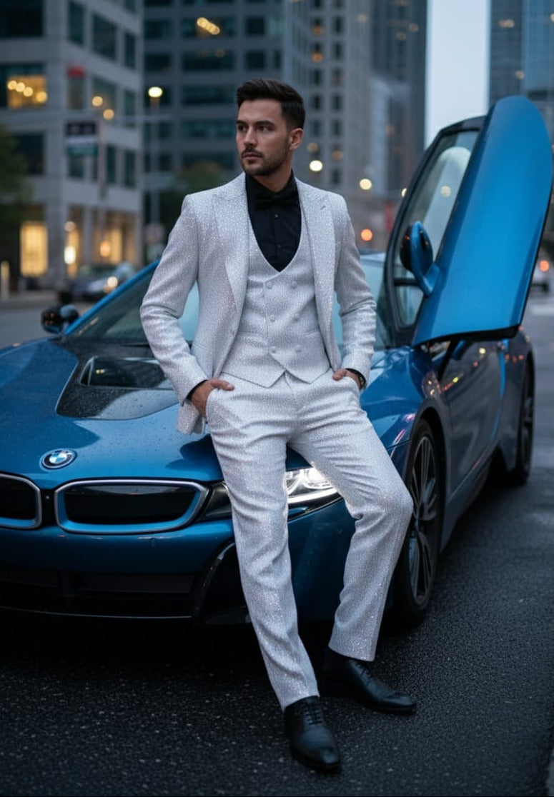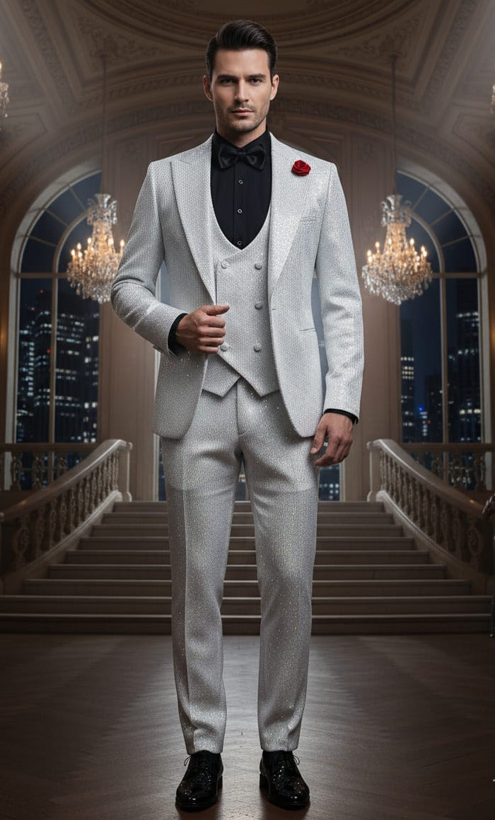 Giovanni Testi 3 Piece 1 Button Slim Fit Sequin Suit, Peak Lapel, Double Breast Vest, Side Vent with Matching Pants,