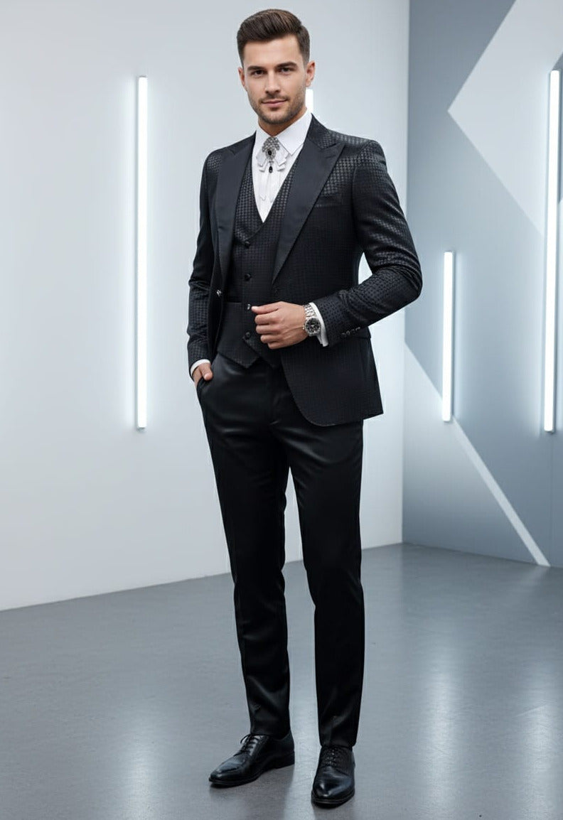 GIOVANNI TESTI 3 Piece Slim Fit Suit, Square tone on tone pattern, Satin Peak Lapel, 1 Button, Center Vent matching satin pants.