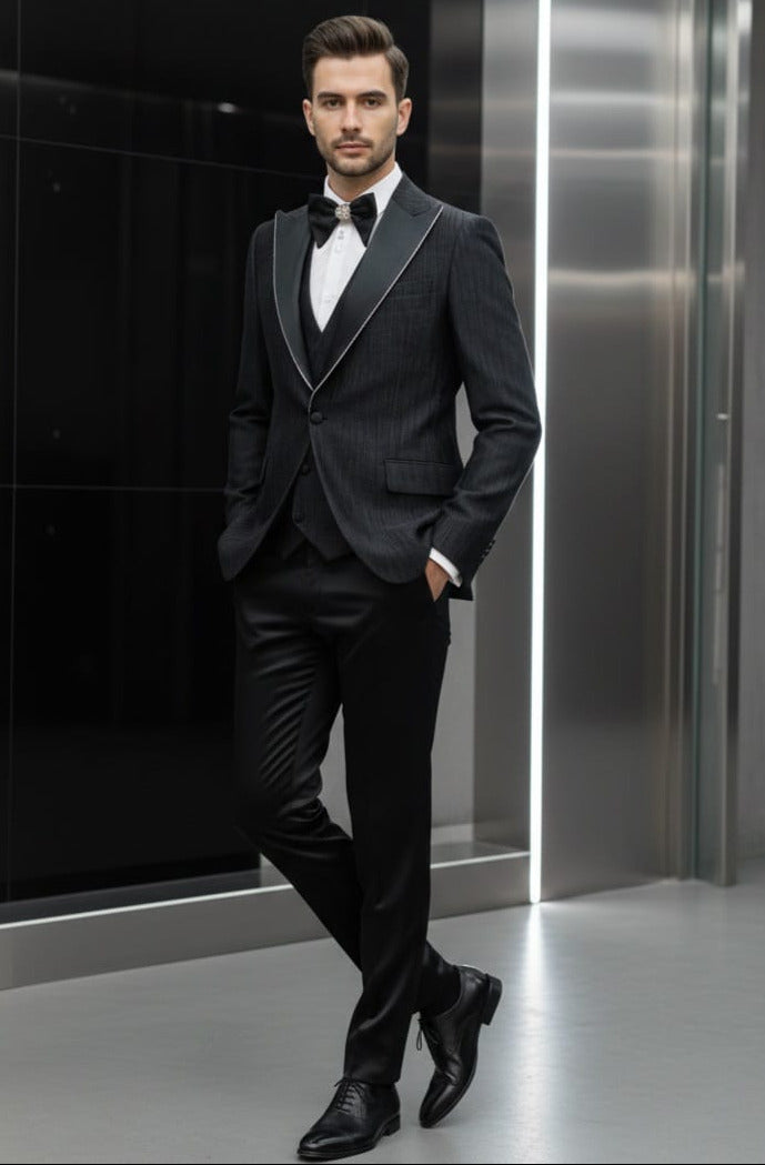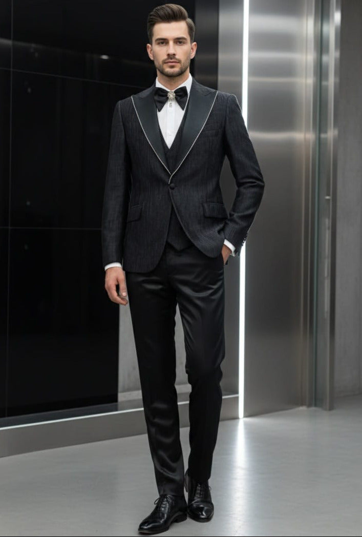 GIOVANNI TESTI 3 Piece Slim Fit Suit, Pleated Fabric, Satin Peak Lapel with Jewel Trim, 1 Button, Center Vent, matching satin pants.