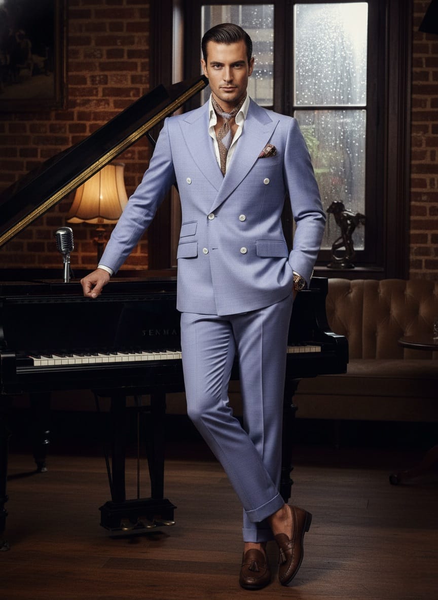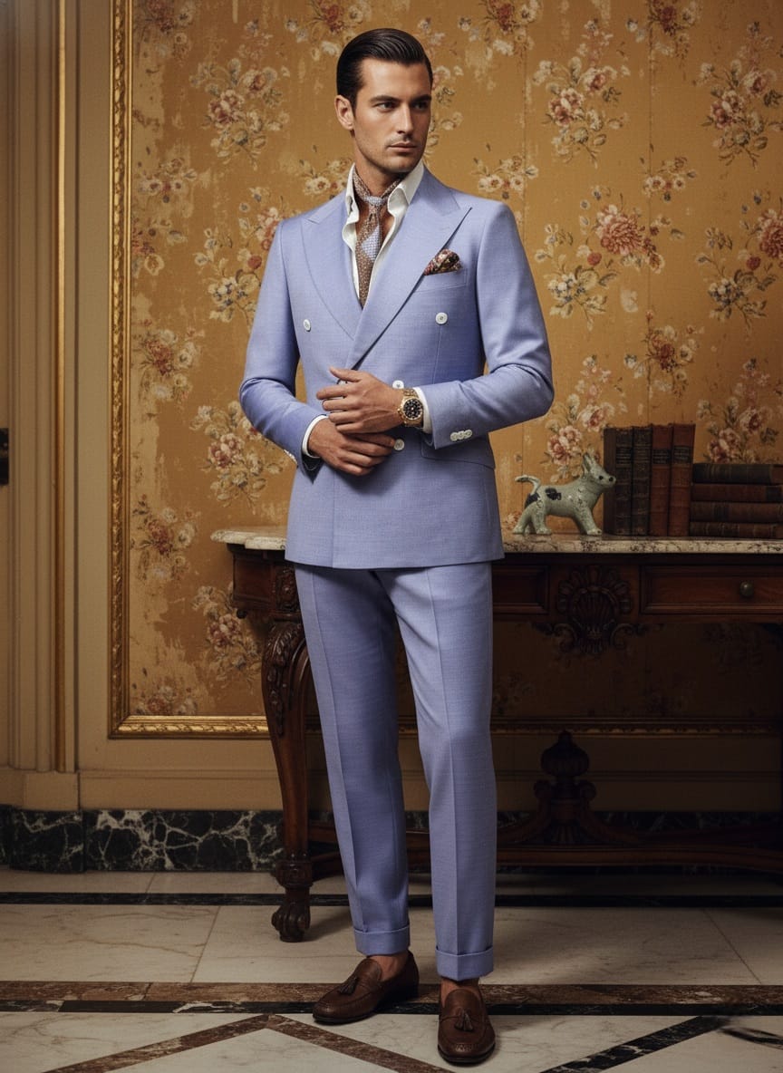 GIOVANNI TESTI , Slim Fit, 2 Piece Double Breast Suit with 6 Buttons. Peak Lapel and Center Vent.