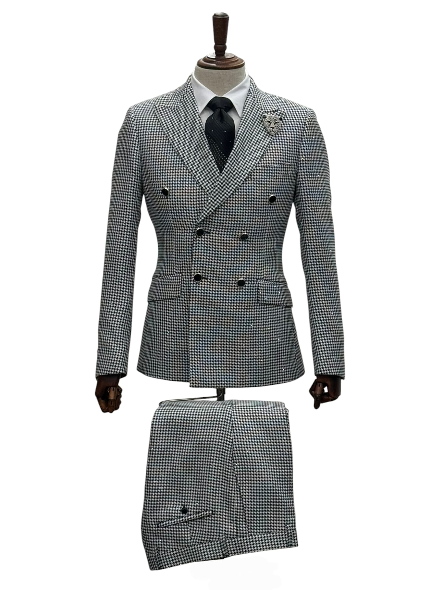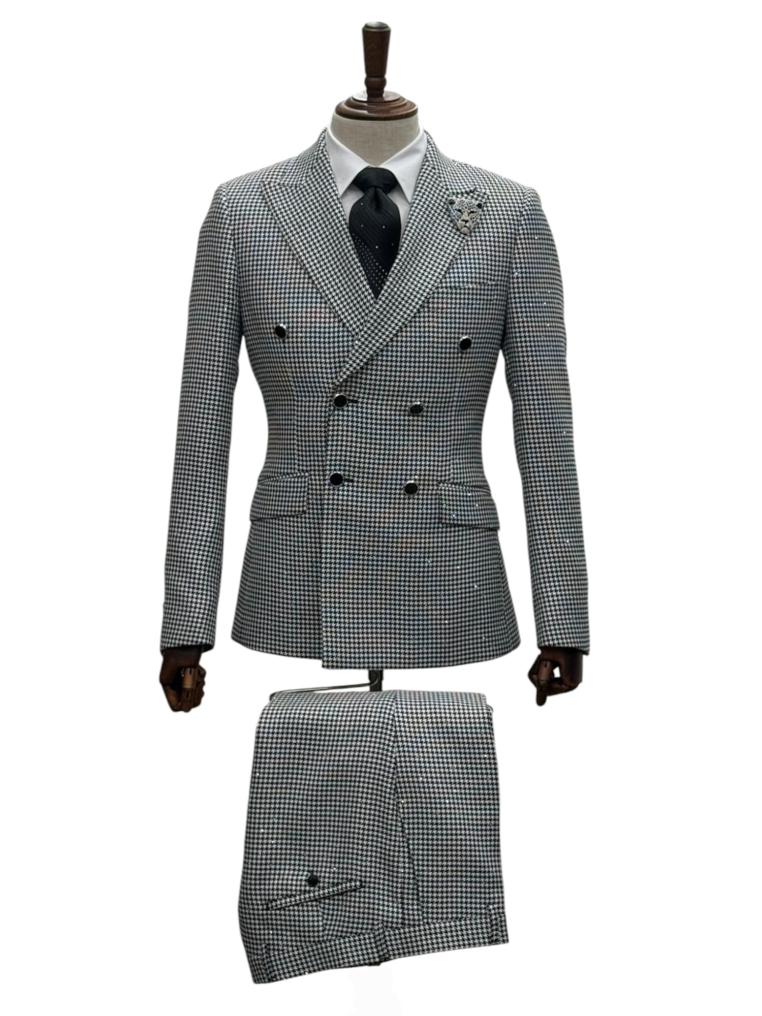 GIOVANNI TESTI , Slim Fit, 2 Piece Double Breast Suit with 6 Buttons. Hounds Tooth Pattern with Stones, Peak Lapel and Side Vents.