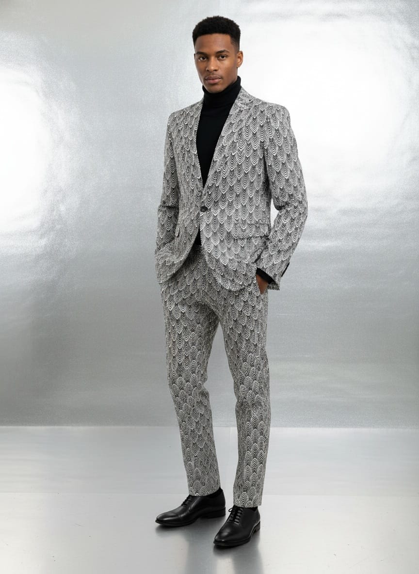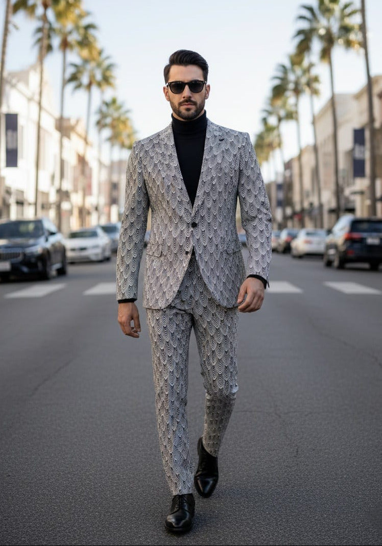 Giovanni Testi Slim Fit 2Pc Suit with Stretch Construction, Black and White Overlapping Feather Pattern, 1 Button, Peak Lapel and Side Vents.