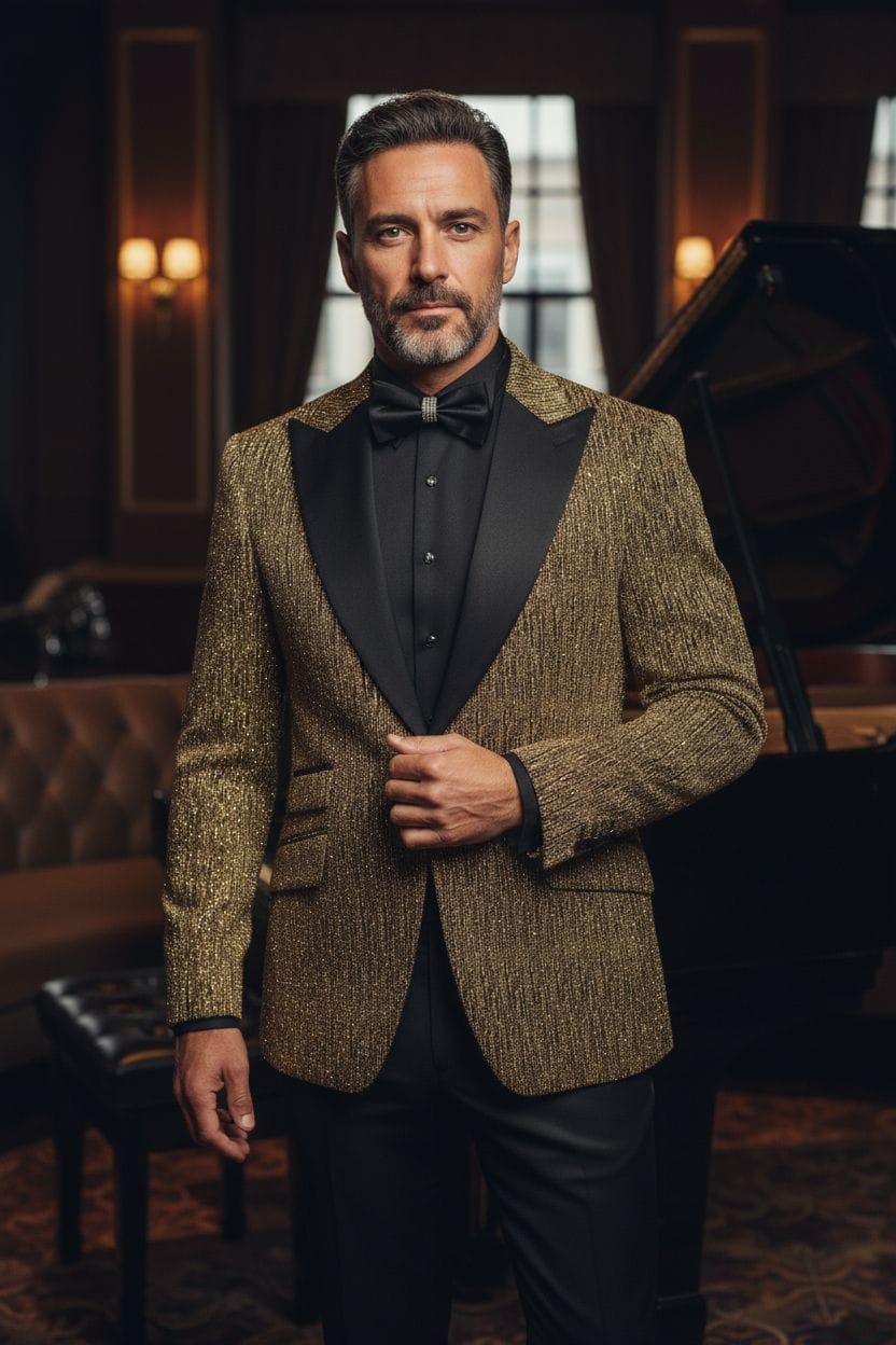 Giovanni Testi Slim Fit Jacket, Jewel Studded Textured Fabric, 1 Button, Black Satin Peak Lapel.