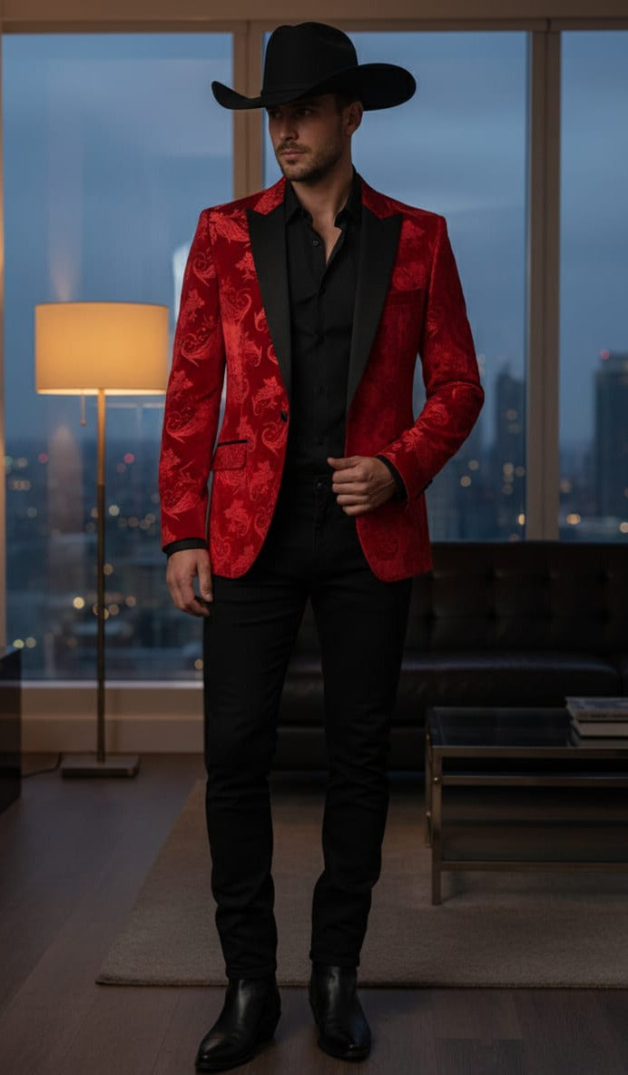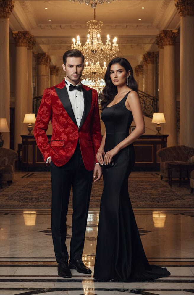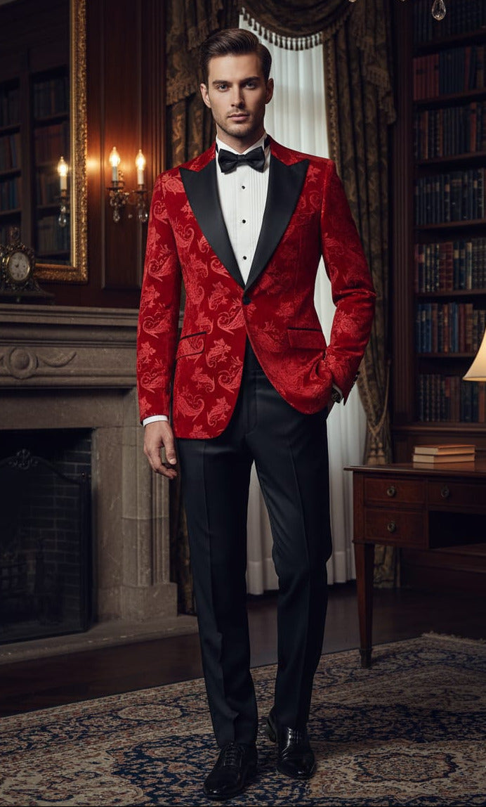Giovanni Testi Slim Fit Velvet Jacket, Paisley Pattern, 1 Button, Black Satin Peak Lapel, Pocket Flaps and Side Vents.